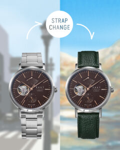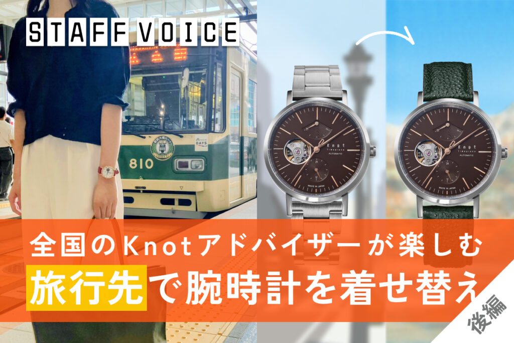 シーンに合わせて気軽にストラップを着せ替えて、旅先でもコーディネートも楽しむ…Knotのウォッチ&ストラップに詳しいアドバイザーならではの楽しみ方でした!後編も楽しみにお待ちください。