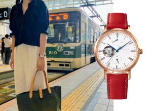 「時計は機械式オープンハートをチョイス。時を刻む機械の動きを眺めながら、広島の歴史とともにゆっくり時間を味わう。思い出の写真を撮りながら、時計と一緒に“旅の時間”を共有できそう!」