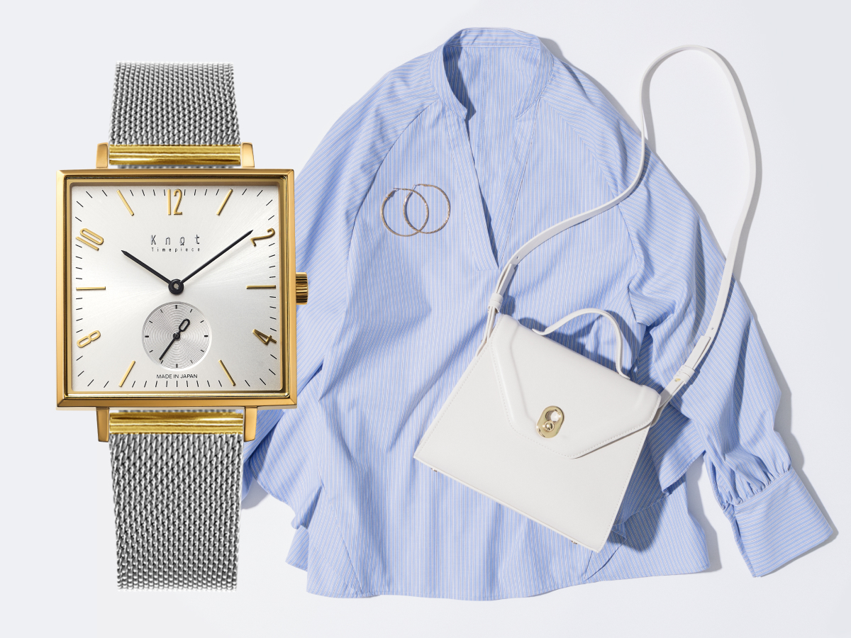 「暖かい日はシャツスタイルなどが増えるので、軽やかさとアクセサリーのような存在感をだせるステンレスメッシュを合わせます。イエローゴールドとシルバーのバイカラーなので、あわせるアクセサリーの色を選ばずに使えます。」